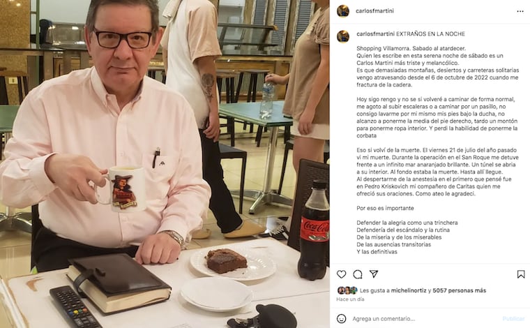 “Quien les escribe en esta serena noche de sábado es un Carlos Martini más triste y melancólico”, empieza su texto en el epígrafe. “Es que demasiadas montañas, desiertos y carreteras solitarias vengo atravesando desde el 6 de octubre de 2022 cuando me fracturé de la cadera. Hoy sigo rengo y no se si volveré a caminar de forma normal”, prosigue.