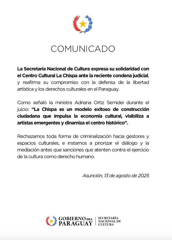 La Secretaría Nacional de Cultura expresa su apoyo a la Chispa Cultural, luego de la condena judicial que recibió por “contaminación del aire y emisión de ruidos dañinos”. La cartera estatal reconoce su aporte al desarrollo del arte y de la cultura.