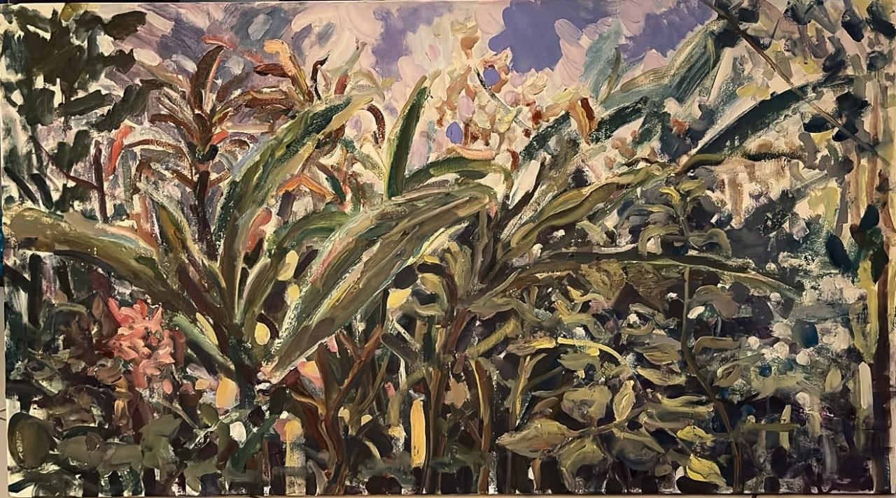 “A simple vista son evidentes los intereses del artista que retrata con sus pinceladas agitadas: la exuberancia natural que lo rodea, la luz diáfana que atraviesa hojas y refleja sobre el agua, la sinuosidad de una liana o del cuello de un ave, así también la arquitectura centenaria de una casona en semi abandono o una multitud, con rostros desdibujados, ocupando algún espacio público”, menciona en su texto, la curadora, Sandra Dinnendahl López.