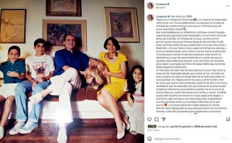 La mediática comunicadora utilizó su perfil en Instagram para compartir con sus seguidores una fotografía familiar. La misma data del año 1989 y corresponde a una temporada de fiestas. En la imagen se la ve con 9 años de edad junto a su padre, el Dr. Rubén Sapena, sus hermanos, su perro ‘Andy’ y su madre, Julia Bibolini, en la antigua casa que tenían en Villamorra.