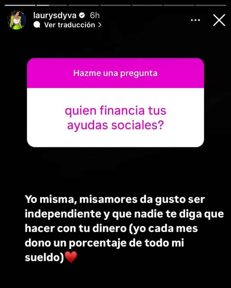 Fue un usuario de Instagram, quien consultó a la famosa, cómo financia sus obras sociales, en respuesta Laurys escribió: “Yo misma, mis amores da gusto ser independiente y que nadie te diga que hacer con tu dinero, yo cada mes dono un porcentaje de todo mi sueldo”. En reacción a esta revelación, una fan del batallón pynandi señaló, que muchas mujeres buscan sponsor, pero que Laurys logra sus metas con sus propios recursos.