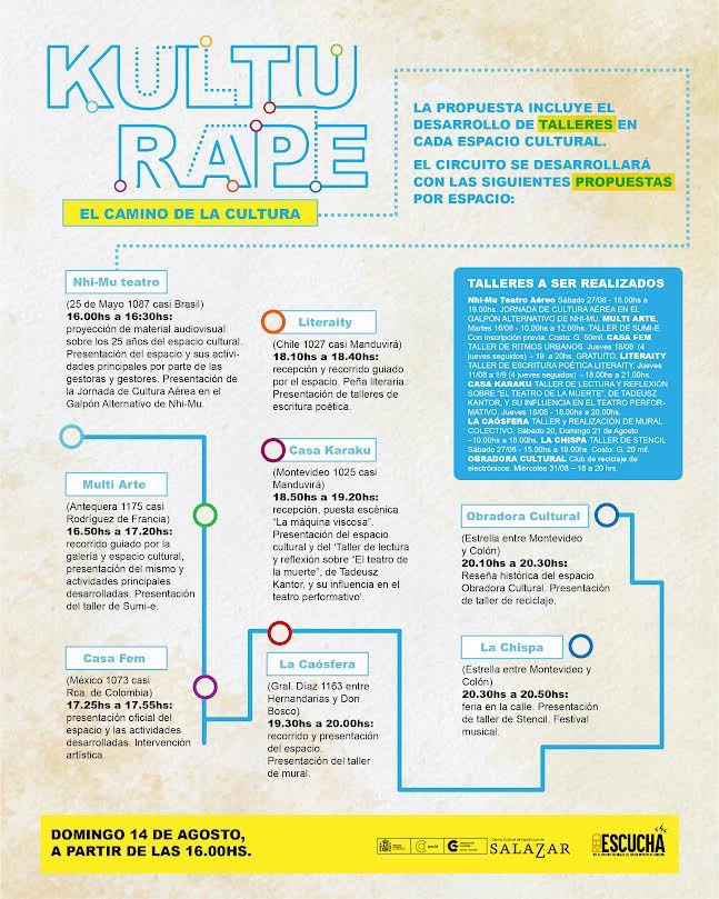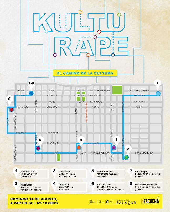 KultuRape se denomina la iniciativa que impulsa la Red de Espacios Culturales del Centro Histórico de Asunción (Red EsCuCha), la cual consiste en un recorrido guiado por los espacios integrantes de la misma y las calles de la capital. La cita es este domingo 14 de agosto, desde de las 16:00. A las personas interesadas en participar, se sugiere la inscripción previa.
