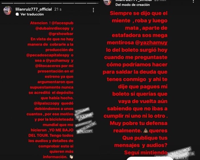 Lilian Ruíz denunció haber sido estafada por la productora del espectáculo ‘Pecados Capitales’. La exmodelo reveló mensajes suyos y de otras personas que afirman una situación similar con la mujer.