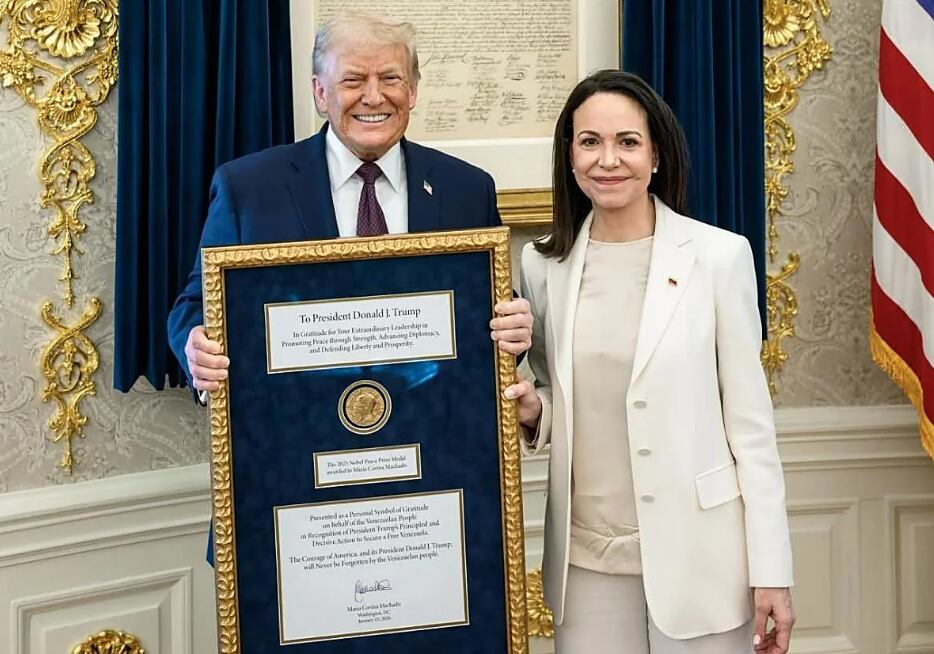 La líder opositora venezolana María Corina Machado le entregó este jueves su medalla del Nobel de la Paz al presidente estadounidense Donald Trump, que ansiaba ganar el galardón el año pasado, y que tildó el gesto de “maravilloso”.