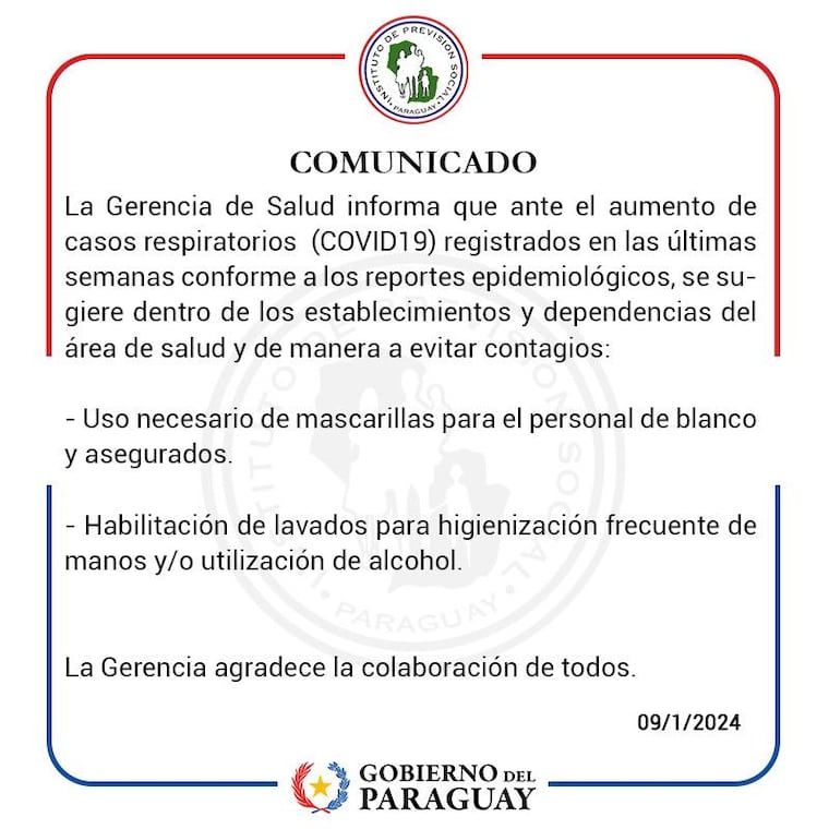 “Ante el aumento de casos COVID registrados en las últimas semanas conforme a los reportes epidemiológicos, se sugiere dentro de los establecimientos y dependencias del área de salud y de manera a evitar contagios: uso necesario de mascarillas para el personal de blanco y asegurados”, expresa parte del comunicado del IPS.