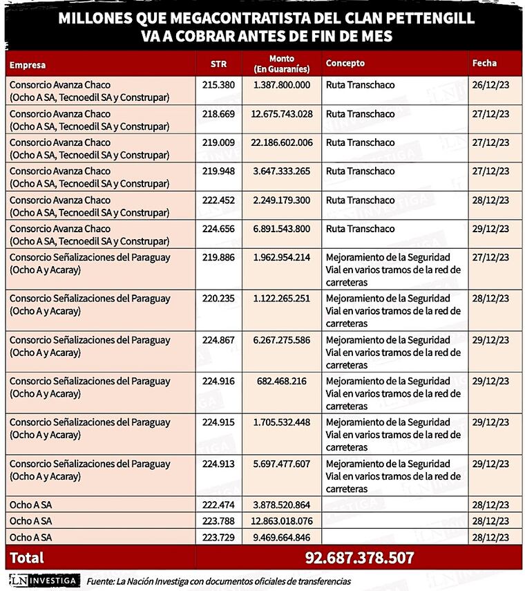 Mientras se acentúa el debate y los cuestionamientos sobre el caso del senador Luis Pettengill Vacca a raíz de que la Contraloría General de la República (CGR) dictaminara que incurrió en conflicto de intereses al votar por el préstamo que favorece a Ocho A SA, megacontratista estatal a la que se lo vincula, la empresa en algunos casos consorciada ya tiene cobros de deudas aprobados en diciembre pasado por valor de G. 92.687 millones por parte del Ministerio de Obras Públicas y Comunicaciones (MOPC) que deben cancelarse antes de fin de mes.