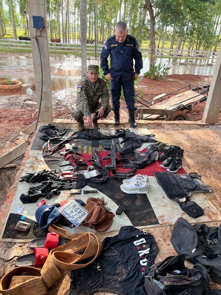 En el procedimiento realizado en la vivienda ubicada en la colonia San Isidro, de Juan León Mallorquín, Alto Paraná, se incautaron vehículos, aparatos celulares, chalecos antibala, armas de diversos calibres, pasamontañas, entre otros elementos.
