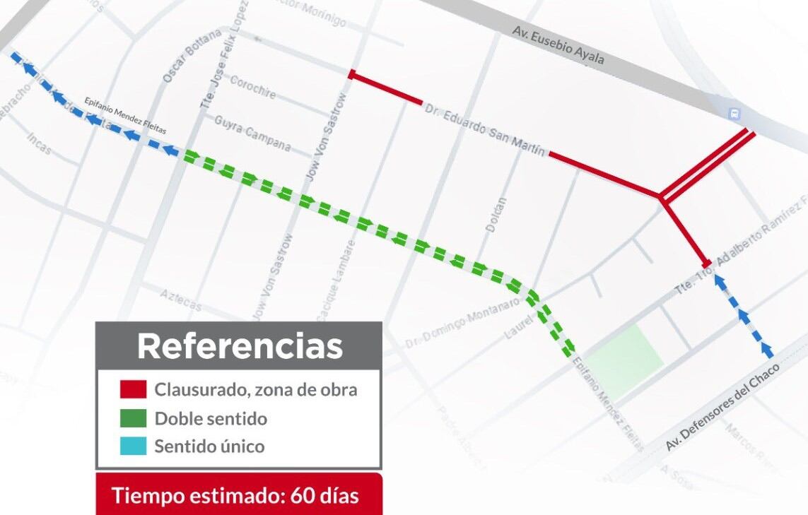 En lo que duren las obras, las calles de doble sentido serán: Epifanio Méndez Fleitas entre Tte. José Félix López y Tte. Primero Adalberto Ramírez.