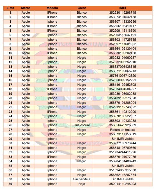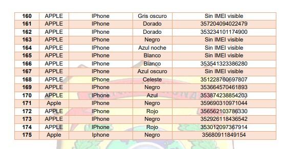 Del lote de celulares incautados en poder de una banda trasnacional en un hotel de calle Palma, unos 175 IPhones todavía están pendientes de identificación. La Policía da a conocer los números de IMEI para que los propietarios puedan reconocerlos.