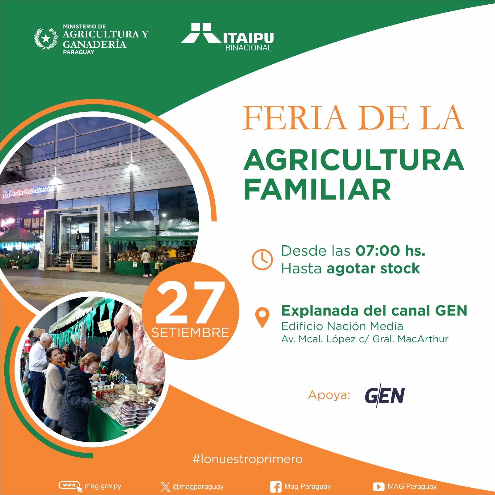 Otra gran feria de la Agricultura Familiar llegará cargada de muchas ofertas en productos del campo y otros insumos, el próximo 27 de septiembre en la explanada de Nación Media, sobre la avenida Mariscal López casi McArthur, desde las 7:00 horas, hasta agotar stock.