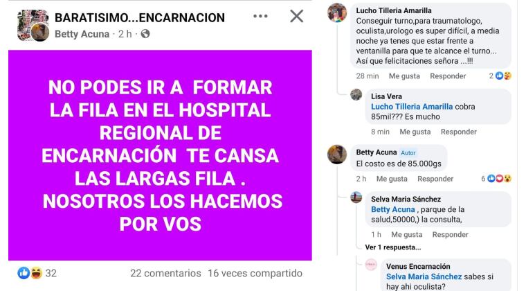 En los últimos días aparecieron diversas publicaciones en Facebook ofreciendo un inusual “servicio” para los pobladores de la zona de Encarnación: formar fila en el hospital regional.