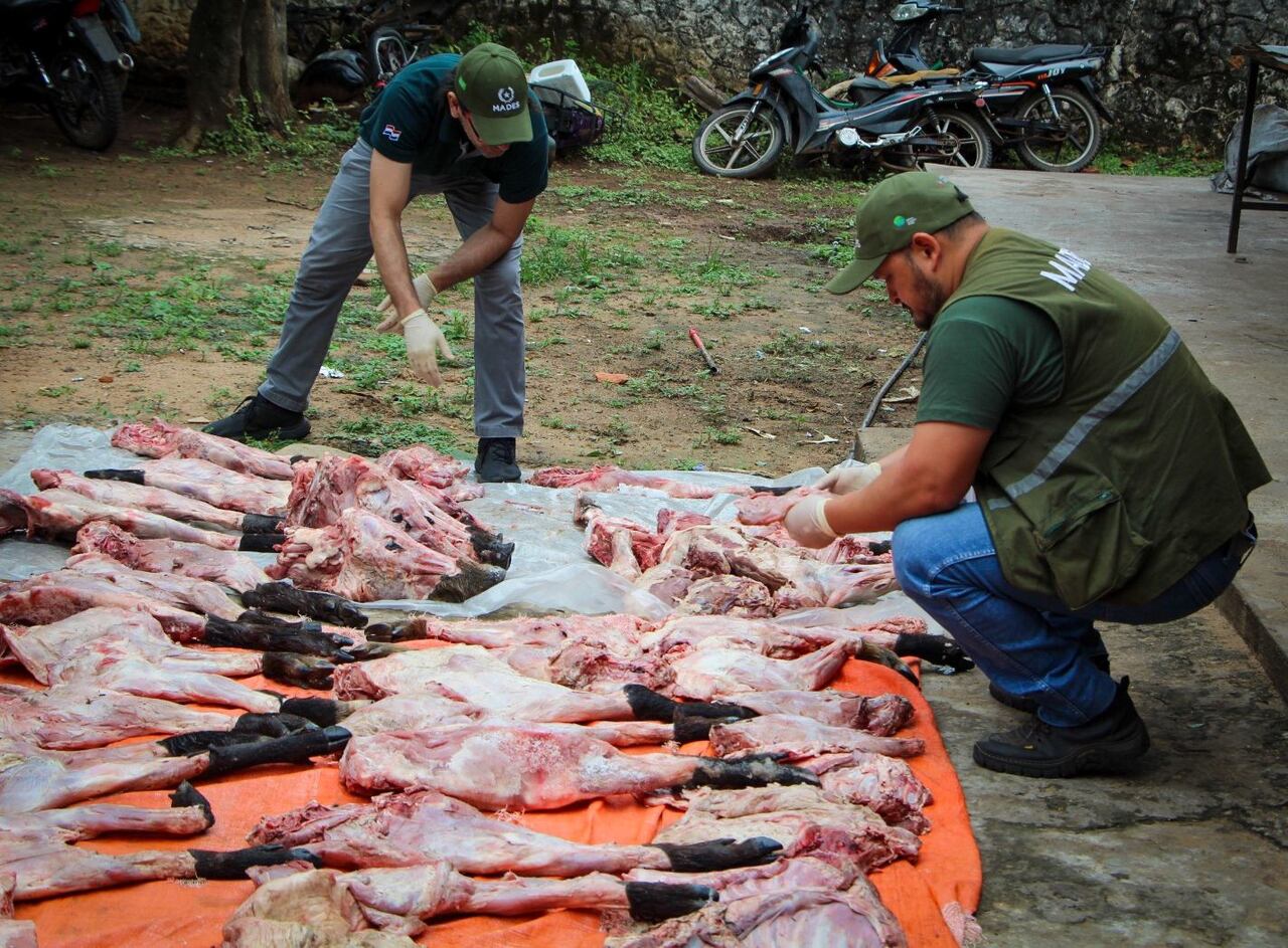 Ante el hallazgo, se dio aviso al Ministerio del Ambiente y Desarrollo Sostenible (MADES) y al Ministerio Público, cuyos representantes verificaron la tenencia y el transporte de, aproximadamente, 350 kilogramos de partes faenadas de jabalíes y de Tañy Kati.
