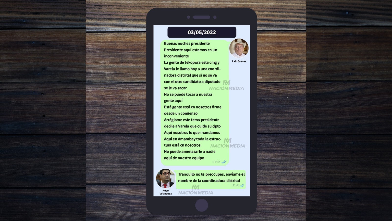 En otro mensaje enviado el 3 de mayo del 2022, Lalo se quejaba de Mario Varela, a quien acusaba de imponer a los funcionarios el apoyo a otra candidatura a la diputación y no a la de Lalo. “Arreglame este tema, presidente. Decile a Varela que cuide su departamento. Aquí nosotros lo que mandamos”. La palabra presidente la utilizaba porque Velázquez en ese momento era precandidato a la Presidencia de la República.
