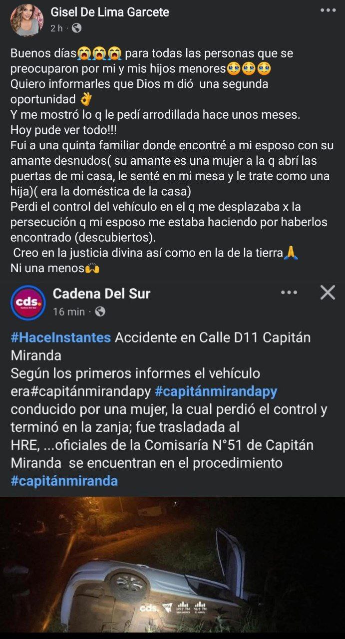 “Perdí el control del vehículo en el que me desplazaba por la persecución que mi esposo me estaba haciendo por haberlos descubierto”, publicó la mujer.