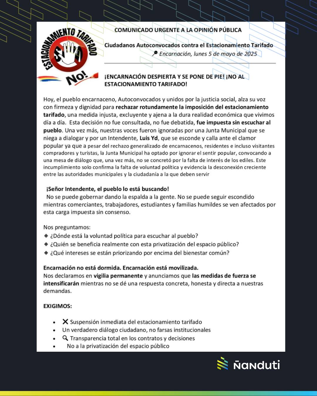 A través de un comunicado, los ciudadanos de Encarnación exigieron la suspensión inmediata del estacionamiento tarifado, al argumentar que la medida afecta negativamente a la actividad comercial, dificulta el acceso a servicios y genera un costo adicional para los pobladores.
