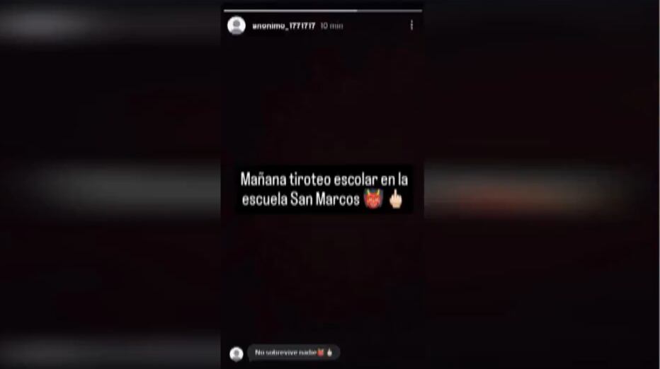 “Mañana tiroteo escolar en la escuela San Marcos”, dice el mensaje publicado en una historia de Instagram, a través de un usuario denominado “anonimo_!?!?”. Más abajo, en un comentario, agrega: “No sobrevive nadie”.
