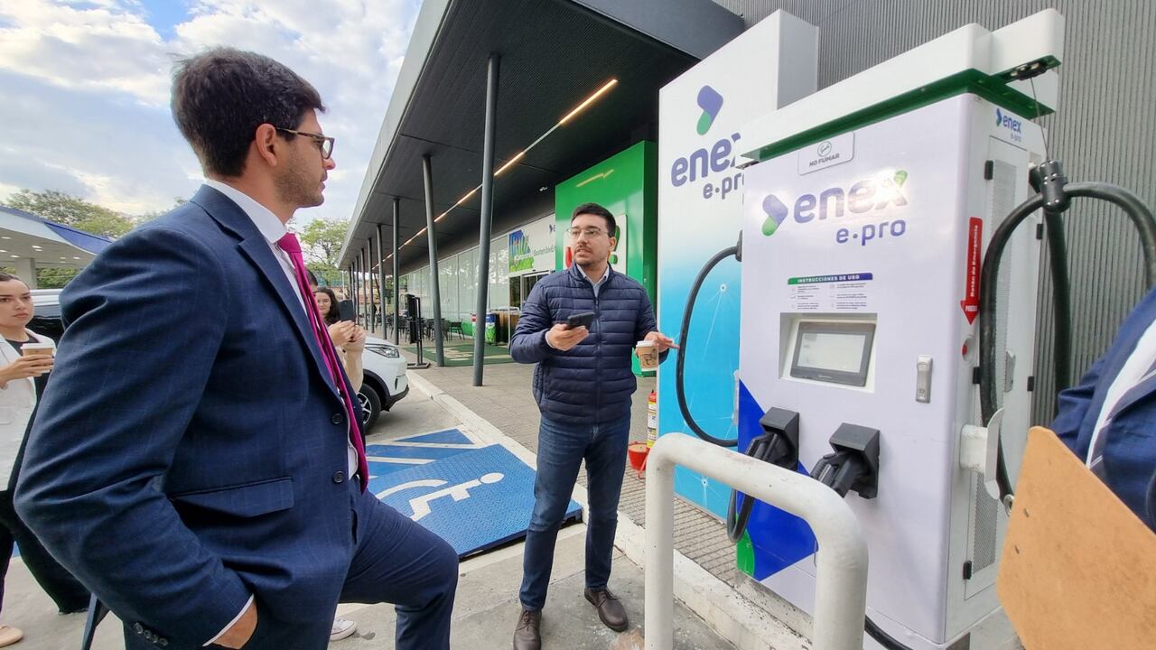 La nueva estación de carga eléctrica es del emblema Enex, ubicada sobre la Avda. San Martín, siendo la segunda de su tipo de esta red de estaciones de servicios.