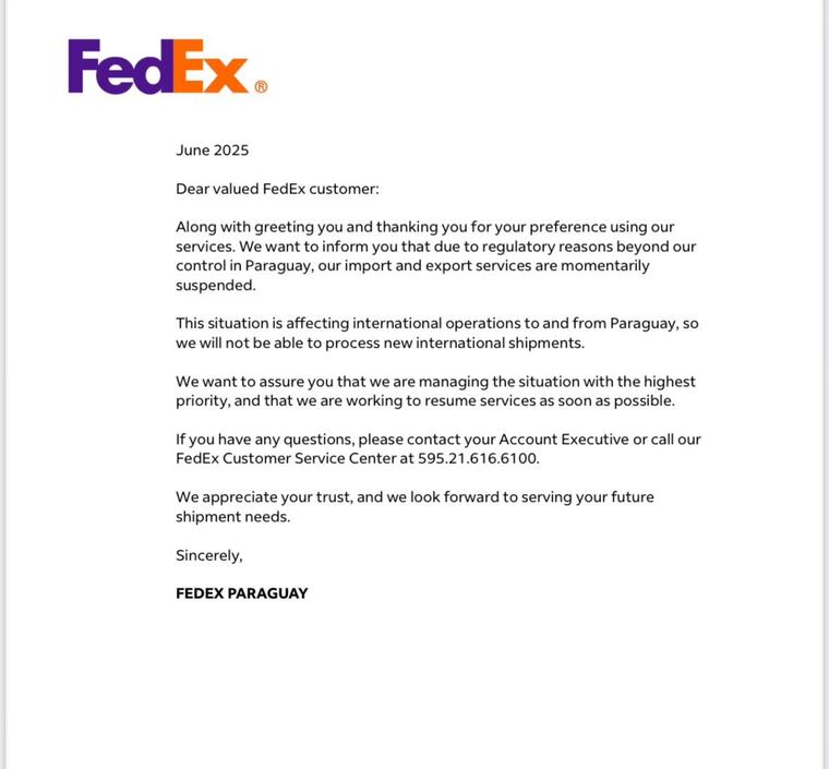 Dicha situación afecta las operaciones internacionales desde y hacia Paraguay, por lo que no podrán procesar nuevos envíos internacionales, señala el texto.