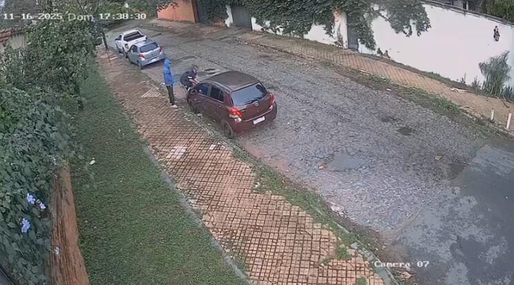 Ese día llegó el domingo 16 de noviembre. Ni bien pasó la tormenta en el barrio Mburicaó de la capital, la cámara de seguridad captó cómo dos hombres se acercaban sospechosamente a uno de los autos de la empresa.