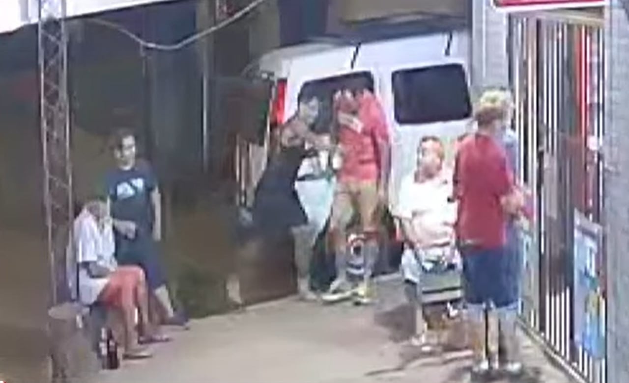 Imágenes de circuito cerrado muestran el momento en que este joven (de camisilla negra) llega junto al grupo y comparte unos breves instantes antes de extraer un cuchillo del bolsillo para atacar al afectado, dándose a la fuga junto a un cómplice que lo estaba aguardando en un vehículo.