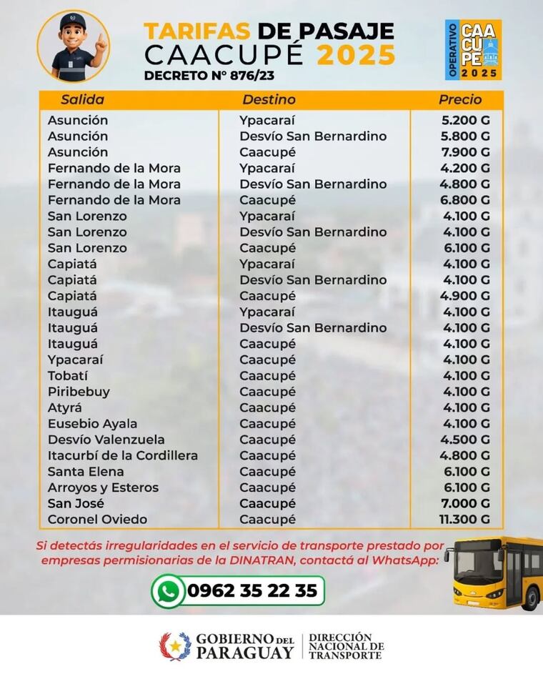 Cabe mencionar que el costo del pasaje es establecido por la Dinatran, y que las medidas adoptadas por el Viceministerio de Transporte buscan facilitar un traslado seguro y ordenado para las personas que se movilizarán durante la tradicional fiesta mariana.