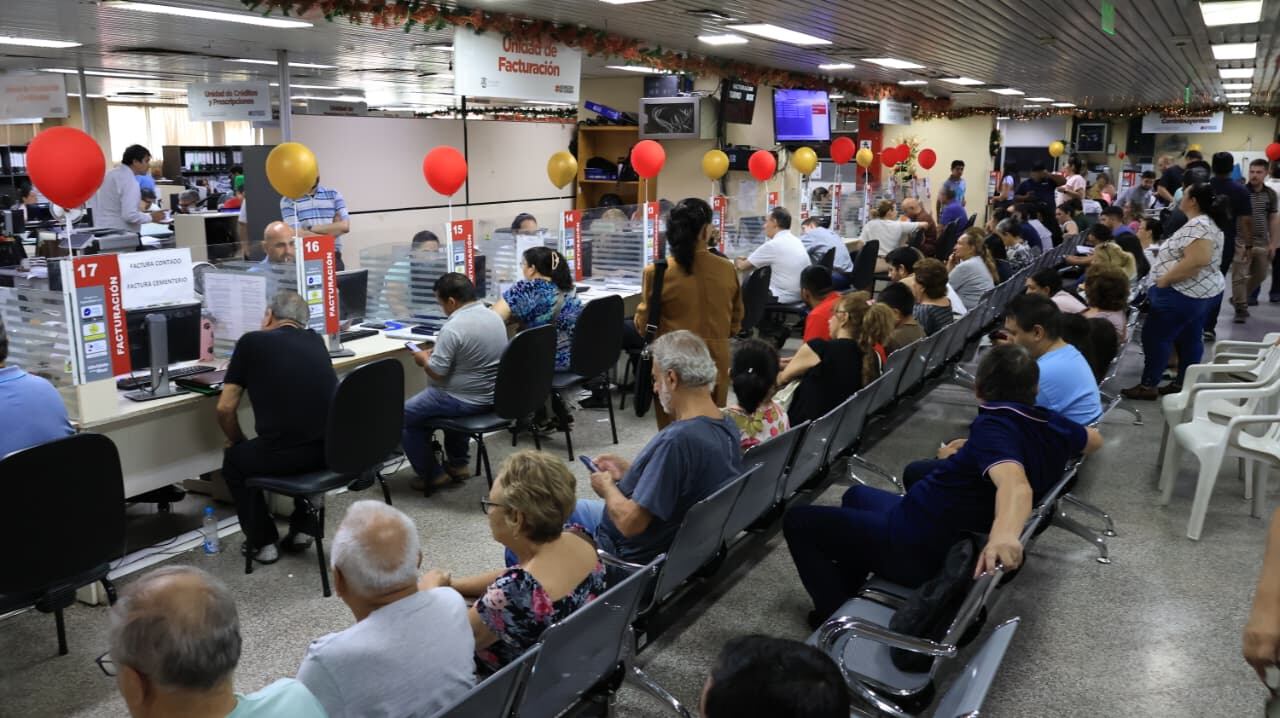 Las cajas municipales atienden en el Palacete Municipal (Mariscal López entre Capitán Bueno y Villamayor), con horarios de lunes a viernes de 07:00 a 16:00 y sábados de 07:30 a 11:30 en la Dirección de Recaudaciones (subsuelo Bloque A) y Dirección de Tránsito (planta baja Bloque C).