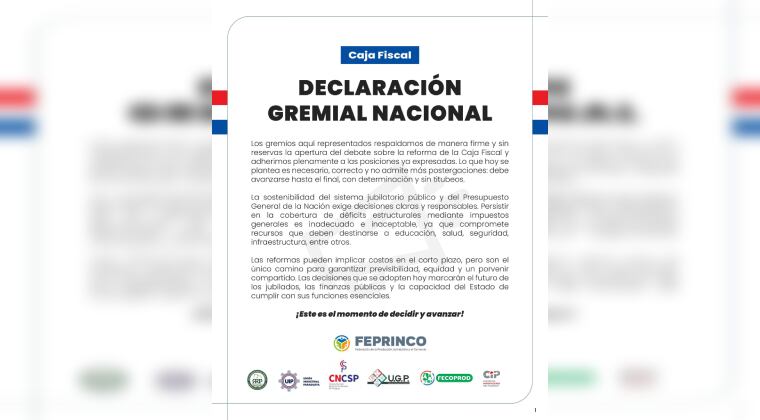 Los citados gremios, que aglutinan a su vez a más de 100 asociaciones, federaciones y cámaras de diversos segmentos económicos, expresaron su respaldo al plan de Reforma de la Caja Fiscal, impulsado por el Poder Ejecutivo.
