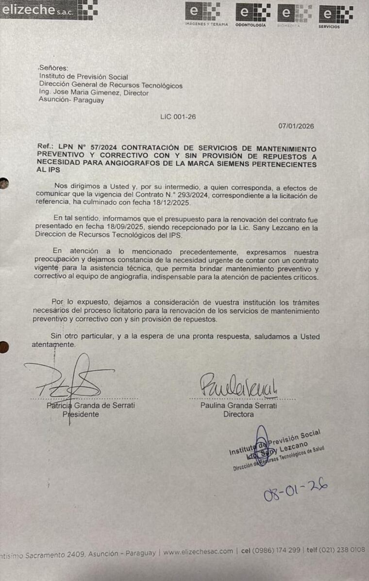 Suman y siguen las irregularidades en torno al servicio ofrecido por el Instituto de Previsión Social. Documentos publicados indican que el equipo para la realización de cateterismo se encuentra sin mantenimiento debido a que finalizó el contrato para el mismo. La empresa encargada advirtió la grave situación que eso conlleva.