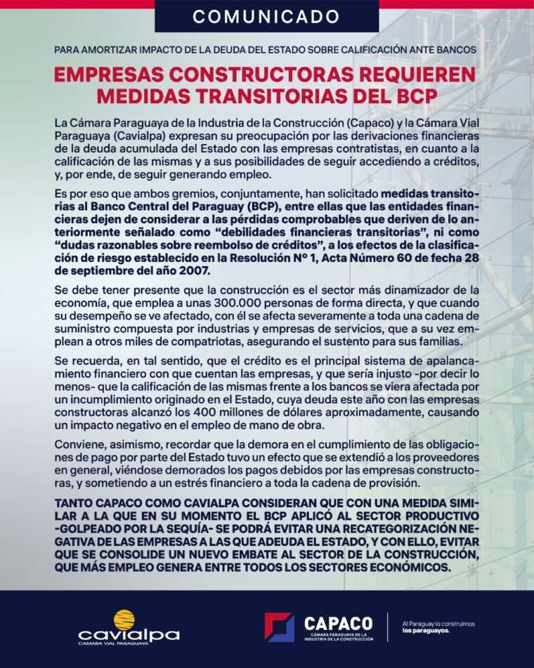 La Cámara Paraguaya de la Industria de la Construcción (Capaco) y la Cámara Vial Paraguaya (Cavialpa) expresan su preocupación por las derivaciones financieras de la deuda acumulada del Estado con las empresas contratistas, en cuanto a la calificación de las mismas y a sus posibilidades de seguir accediendo a créditos y, por ende, de seguir generando empleo.
