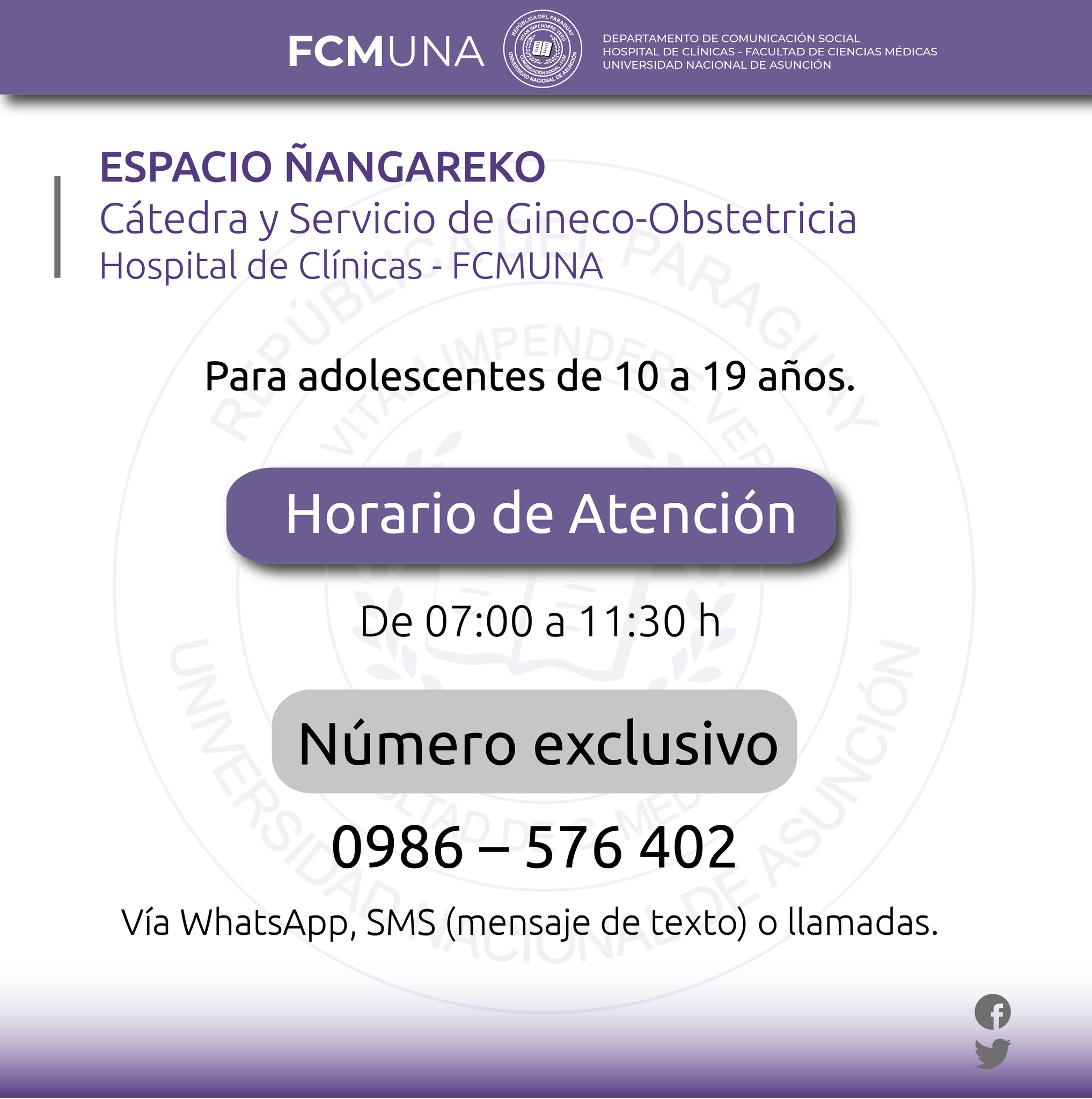 El espacio Ñangareko de la Cátedra y Servicio de Gineco-Obstetricia de la Facultad de Ciencias Médicas de la UNA-Hospital de Clínicas, ofrece atención integral a las adolescentes, direccionada en tres ejes: planificación familiar, ginecología y prenatal.