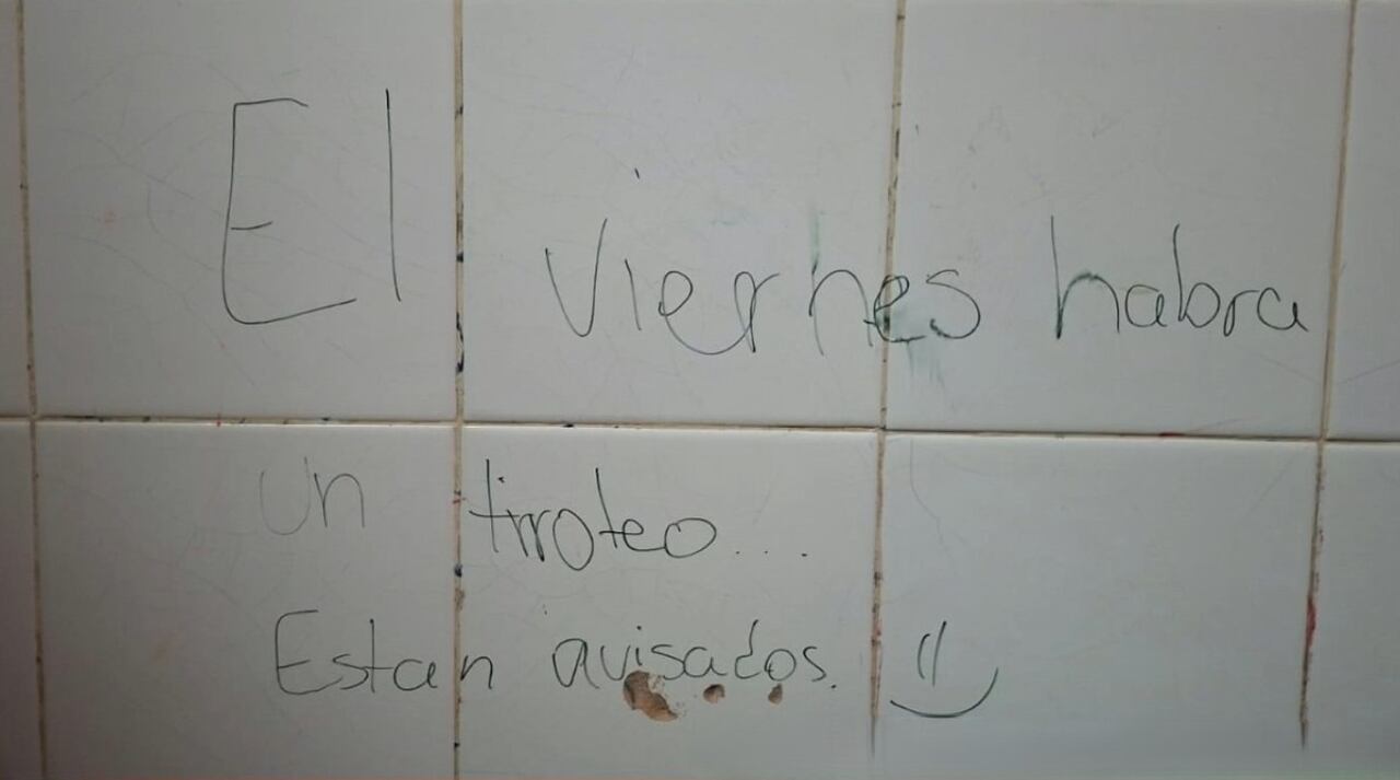 “El viernes habrá un tiroteo, están avisados”, mencionaba la frase escrita en la pared y que fue encontrada por dos estudiantes, quienes posteriormente dieron aviso a las autoridades educativas.