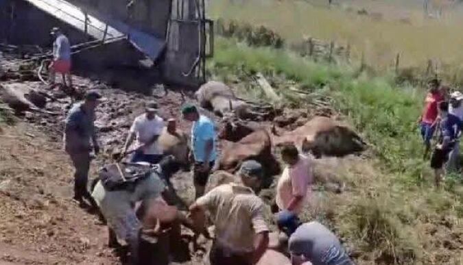 Un camión transganado que transportaba varios ejemplares vacunos sufrió un vuelco en el distrito de Caapucú, departamento de Paraguarí. Pobladores de la zona aprovecharon la ocasión para faenar los animales.