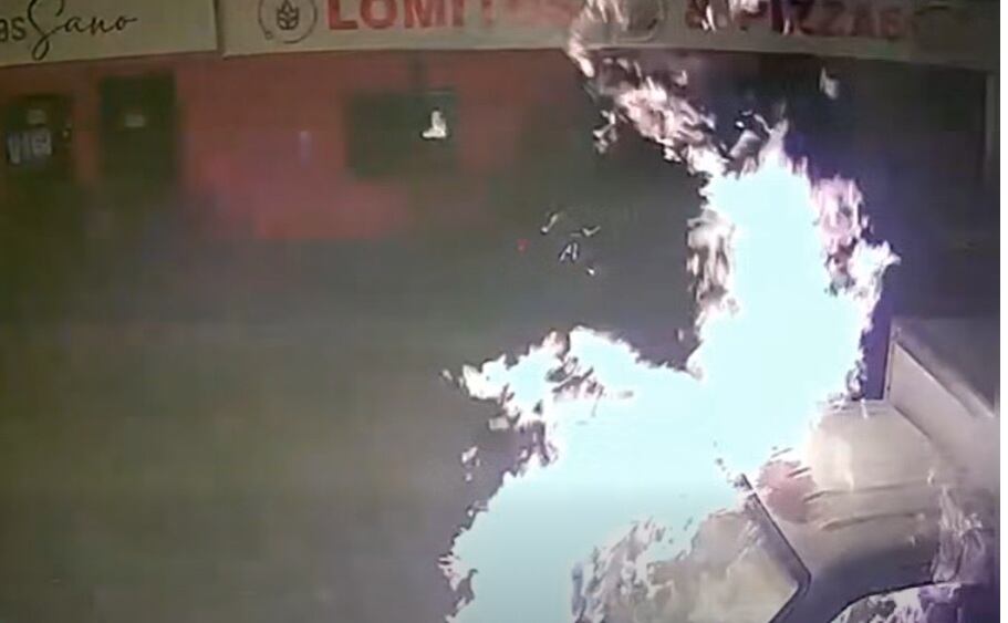 Dos hombres con prendas oscuras y encapuchados llegaron frente al local comercial a bordo de una motocicleta y, aprovechando la nula presencia de personas, derramaron un líquido combustible sobre el vehículo.