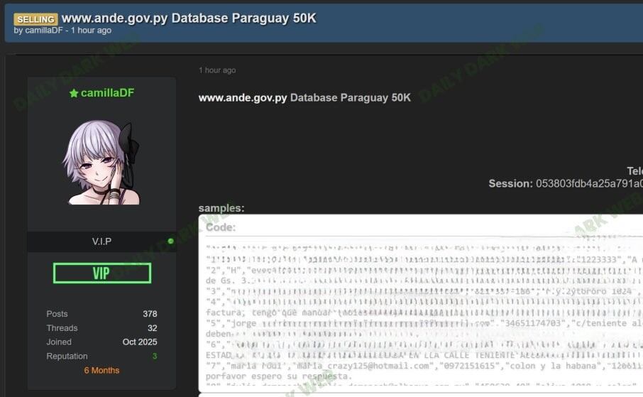 La cuenta en X @DailyDarkWeb, conocida por divulgar filtraciones a nivel global, publicó una alerta sobre una supuesta comercialización de la base de datos de la Administración Nacional de Electricidad (ANDE).