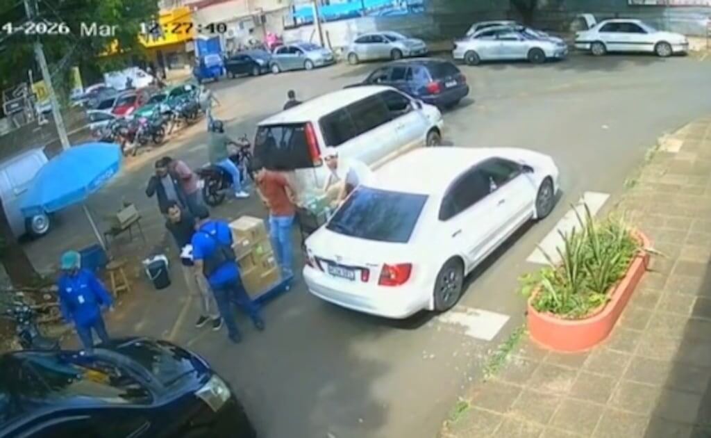 Imágenes de circuito cerrado muestran el momento en que estos ladrones forcejean con las víctimas antes de apoderarse de las cajas y darse a la fuga, a bordo de una furgoneta Toyota tipo Noah color negro.