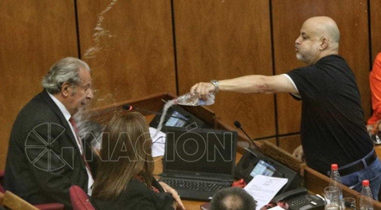Posteriormente el jueves 11 de abril, antes de que se aprobara su sanción por la humillación verbal a Ovelar, ocurrió el episodio de la botellita de agua contra Juan Carlos Galaverna, quien pese a decir “ni se te ocurra Payo”, no pudo frenar a su colega.