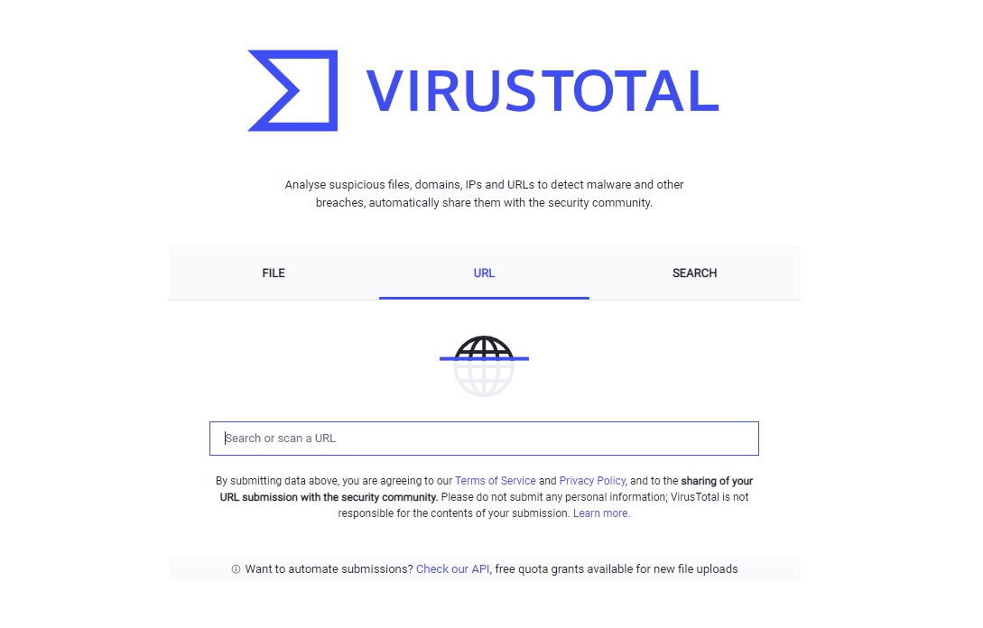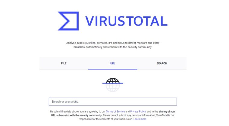 En este caso, se trata de virustotal.com, una página web encargada de analizar links de todo tipo y determinar si existe algún tipo de riesgo contenido en el mismo. Para utilizarlo, solo es necesario pegar la URL que uno desee escanear.