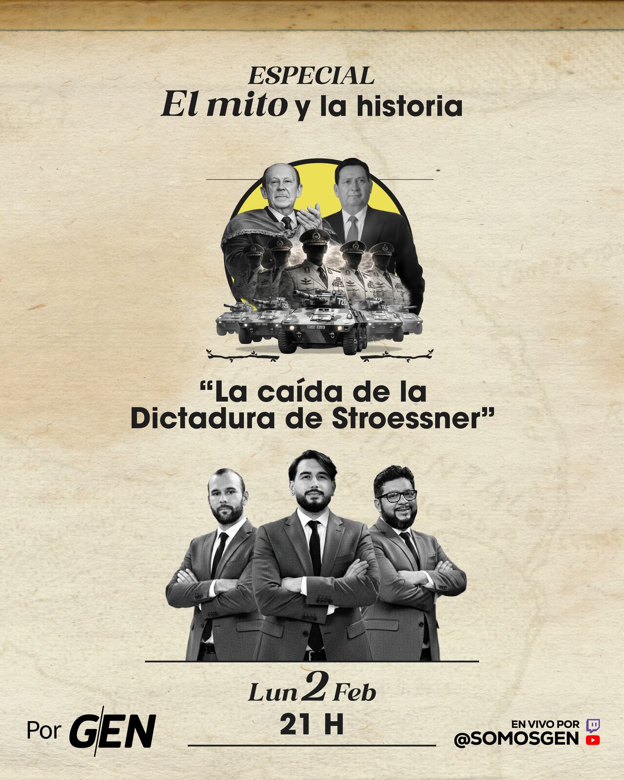 En ese marco, el programa El Mito y la Historia presenta su especial “La Caída de la Dictadura en Paraguay”, que se emitirá este lunes 02 de febrero a las 21:00 horas, por GEN y sus plataformas digitales.