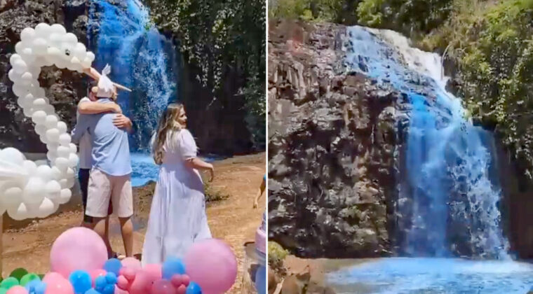 Videos publicados en las redes sociales muestran a la cascada del río Queima-Pé, en el estado de Mato Grosso, volverse de color azul mientras la pareja y sus familiares festejan el género masculino del bebé, en una celebración que se llevó a cabo durante el pasado fin de semana.